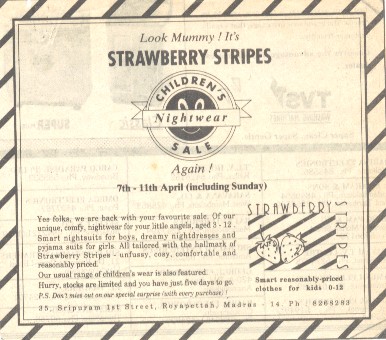 Inspiration : Once given the brief which said that I had to communicate that the Strawberry Children's Nightwear sale is on and that the last year's sale was a success...the starting of Pink Floyd's "Blue Skies" from the Wall struck me... a child's voice is heard to say -"Look Mommy ! There's a plane up there in the sky." This seemed appropriate to me as mostly mothers would be interested in shopping for their kids. So my line was dramatic one and drew the attention of the right audience too. I just had to substitute my product in that line and add the word "Again" to give the product a familiarity. Minoo approved it at the first go. I even had a cute visual for the ad which was attached with the copy sheet and sent to the agency but was not taken.