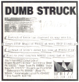 Portrait of bride has charmed its way into his heart STOP Magic of Whizz at work STOP Should get photo of bride's sister too done at Whizz STOP For all your photographic needs STOP Rush to your nearest Whizz Colour Lab and Studio.